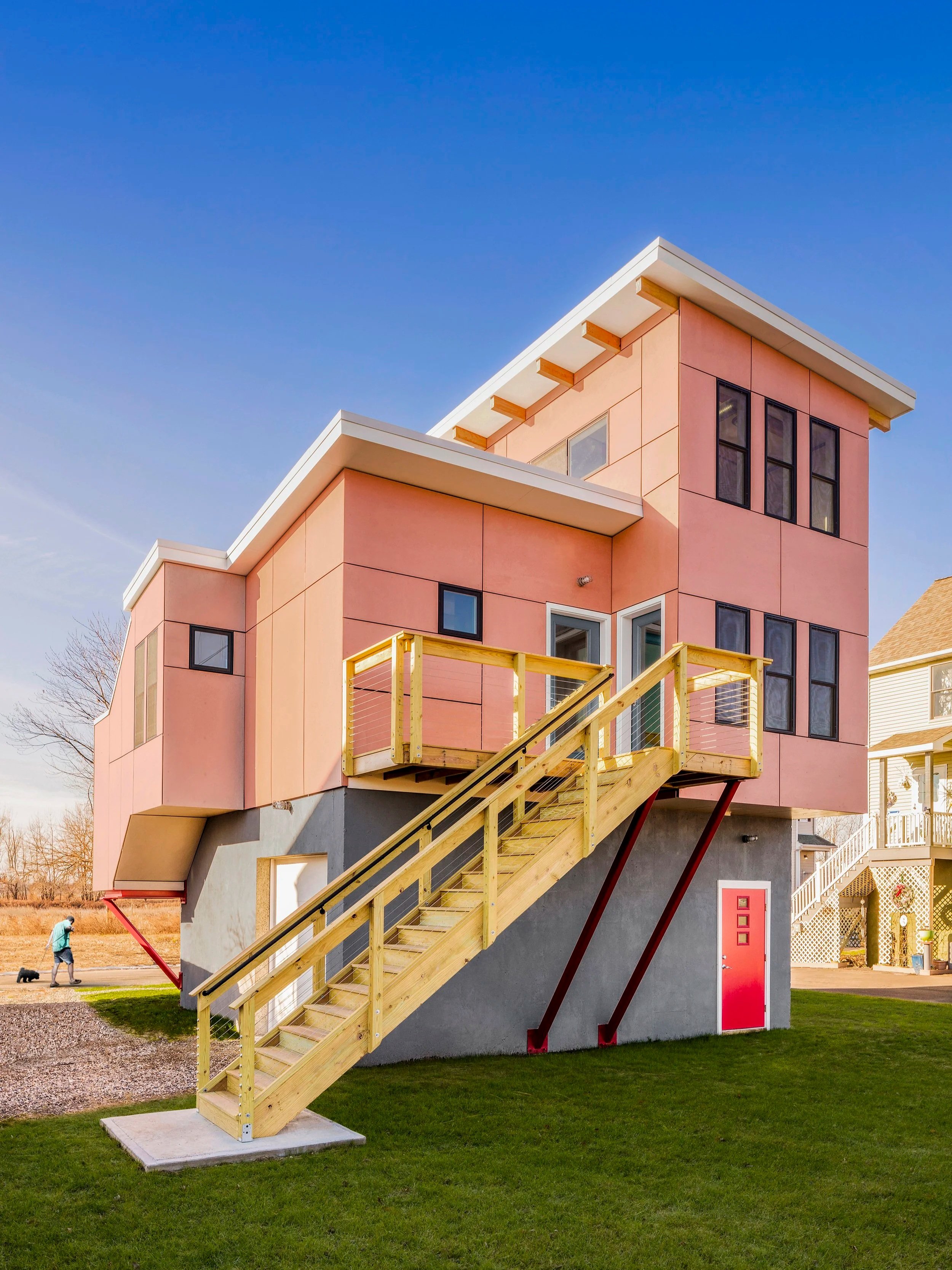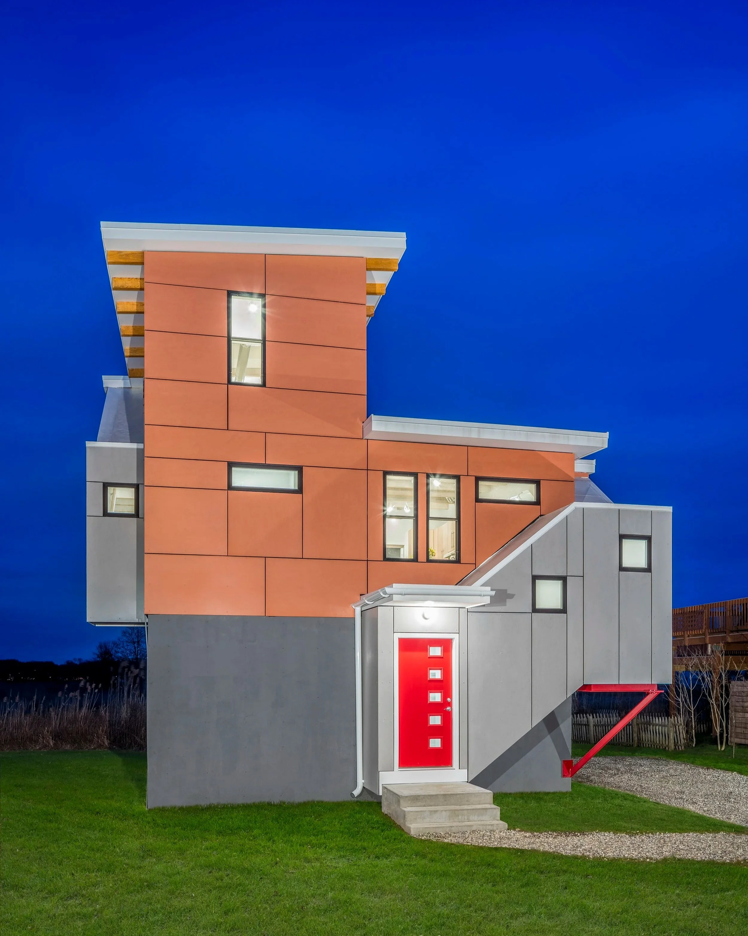 Location: Shoreline CTClient. Private Size: 800 square feetBuilt: 2016Another project undertaken with DOH & CDBG as replacement homes to super storm damaged houses within the flood and wind hazard zones. Open planning, simple, durable materials, fun & bold colors are design cues derived from beach culture.